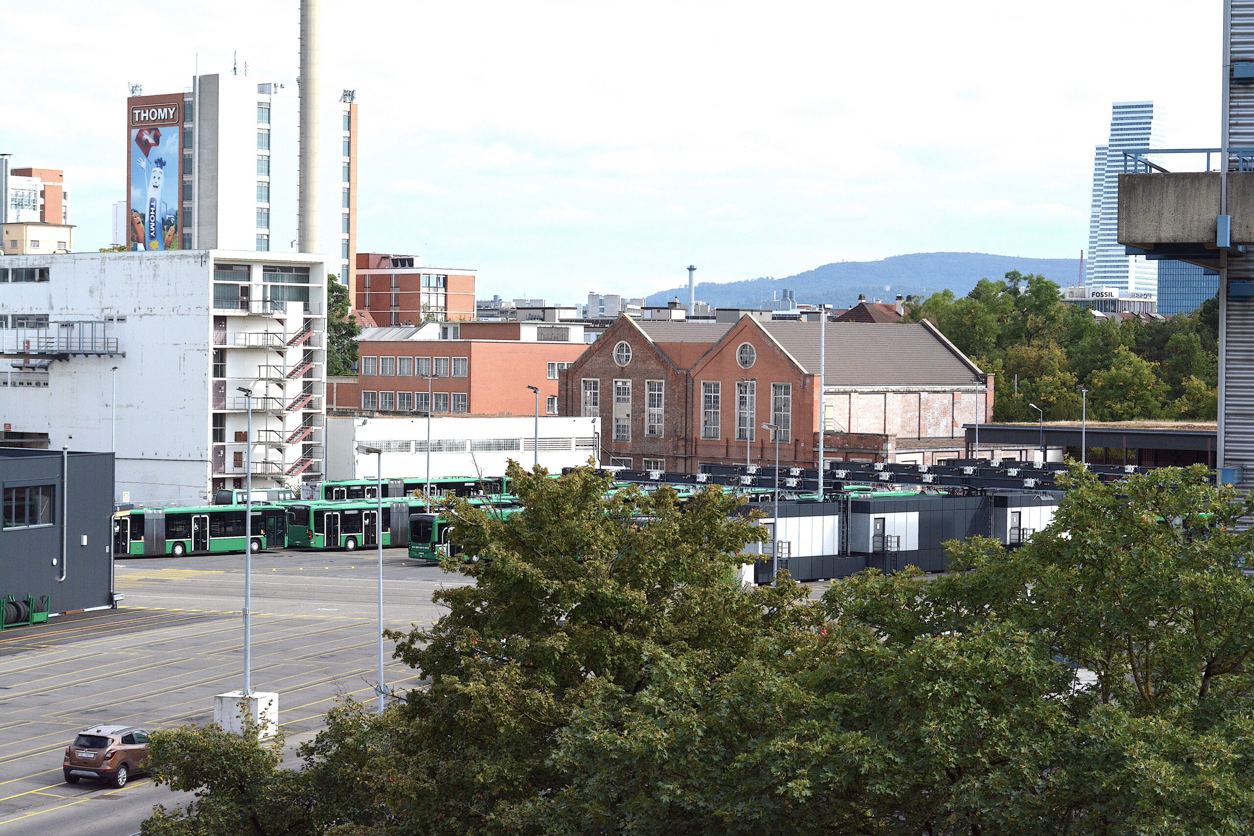 On ne sait pas quelles substances nocives polluent l’air du sol de la Areal 3 de l’ancien site chimique de Klybeck de BASF et de Novartis. Actuellement, les transports publics bâlois BVB l’utilisent comme dépôt de bus. Photo : MfE