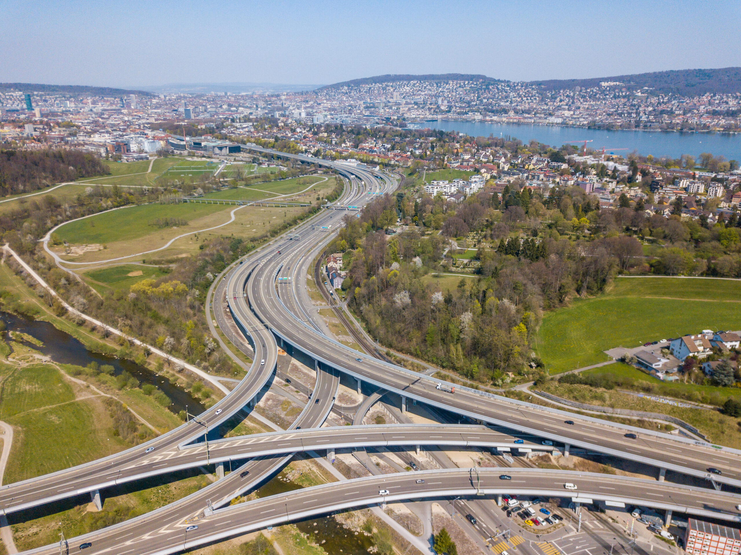 Plus de trafic, plus d’accidents, plus de bruit, plus de pollution de l’air, plus d’usure des pneus, plus de microplastiques et plus de dommages climatiques : voilà pourquoi les MfE dit NON à l’extension extrêmes des autoroutes le 24 novembre. Photo : swissdrone shutterstock